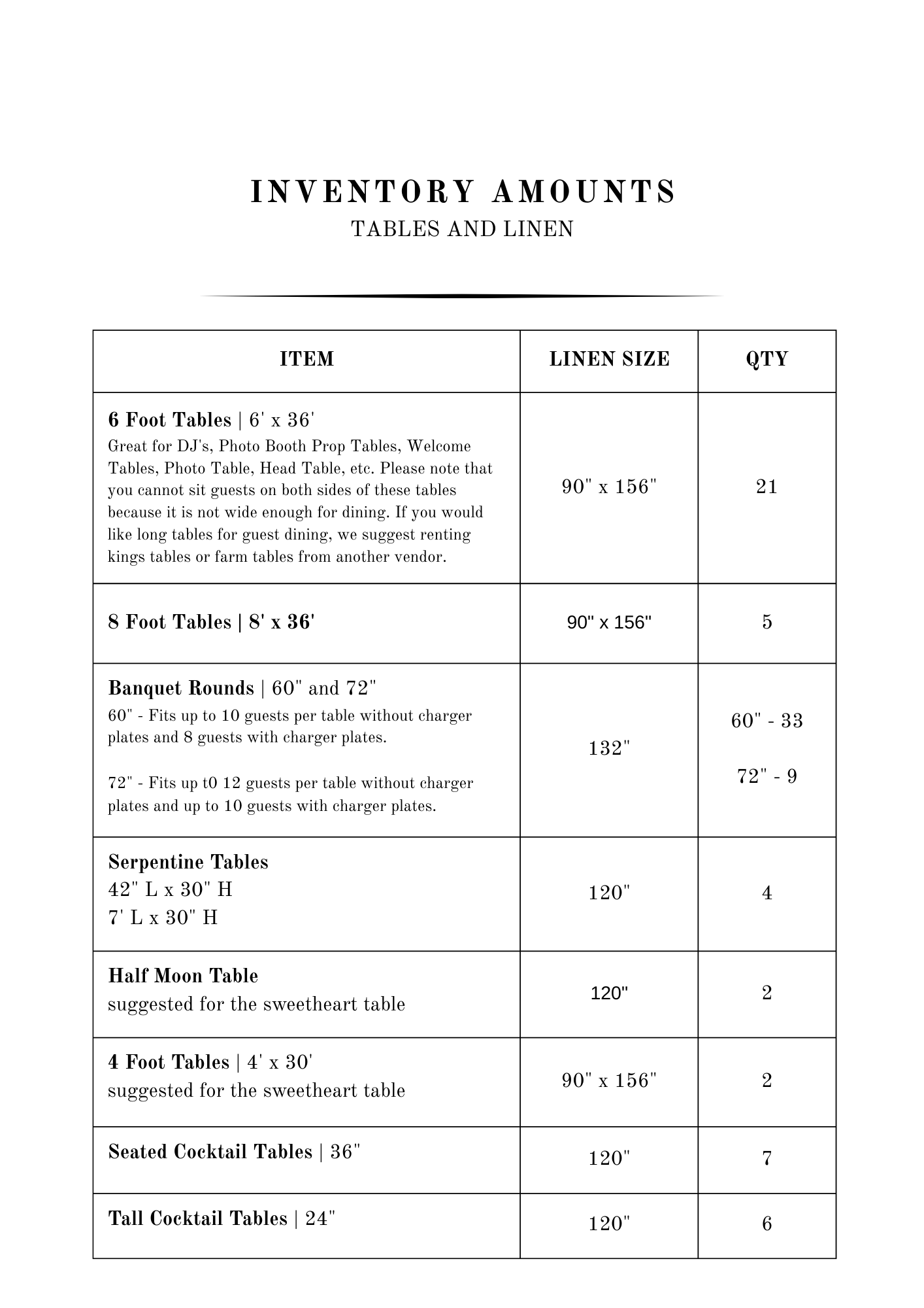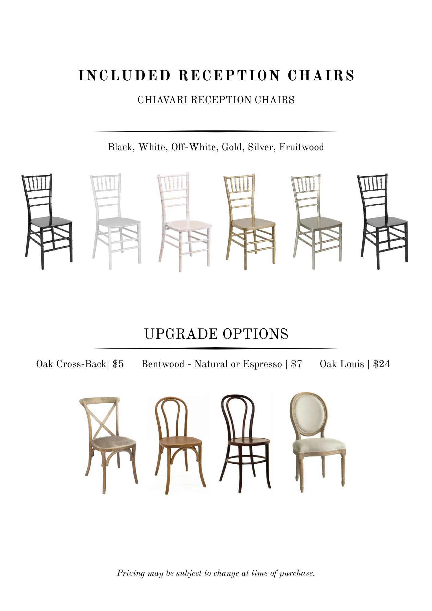 This page outlines the inventory included with your venue, as well as enhancement and upgrade options available to personalize your wedding day. Items not listed may be rented from an outside vendor or purchased separately. For helpful guidance, we invite you to visit our Vendor Recommendations page.